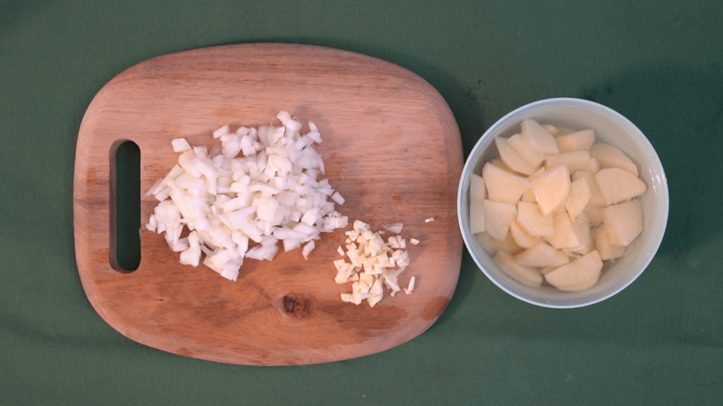 玉ねぎ、にんにくはみじん切りにし、じゃがいもはいちょう切りにカット。じゃがいもは水にさらしておく。