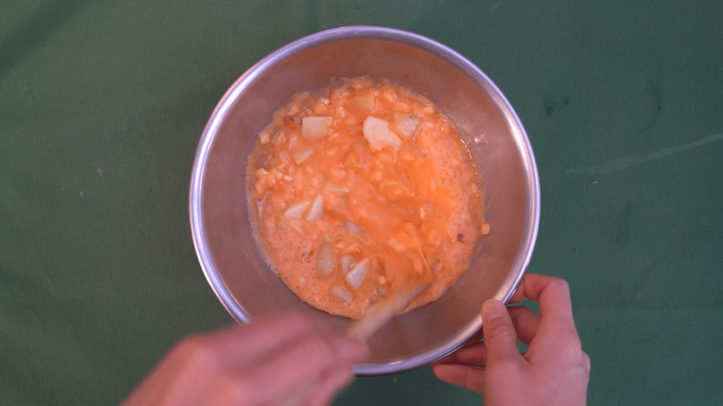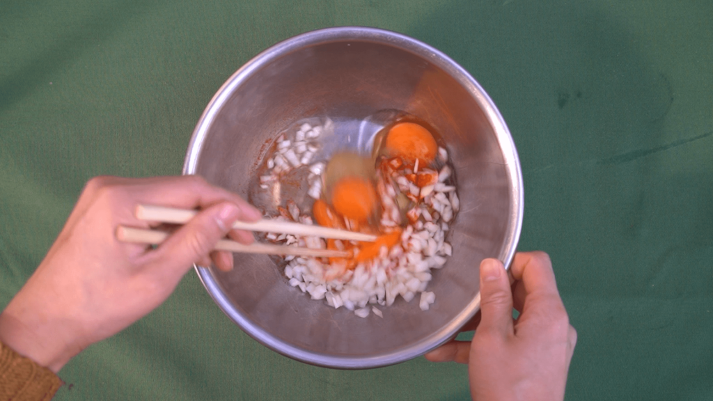 卵4個、塩、こしょう、パプリカパウダー、そして先ほどの玉ねぎとにんにくを全て混ぜ合わせます。