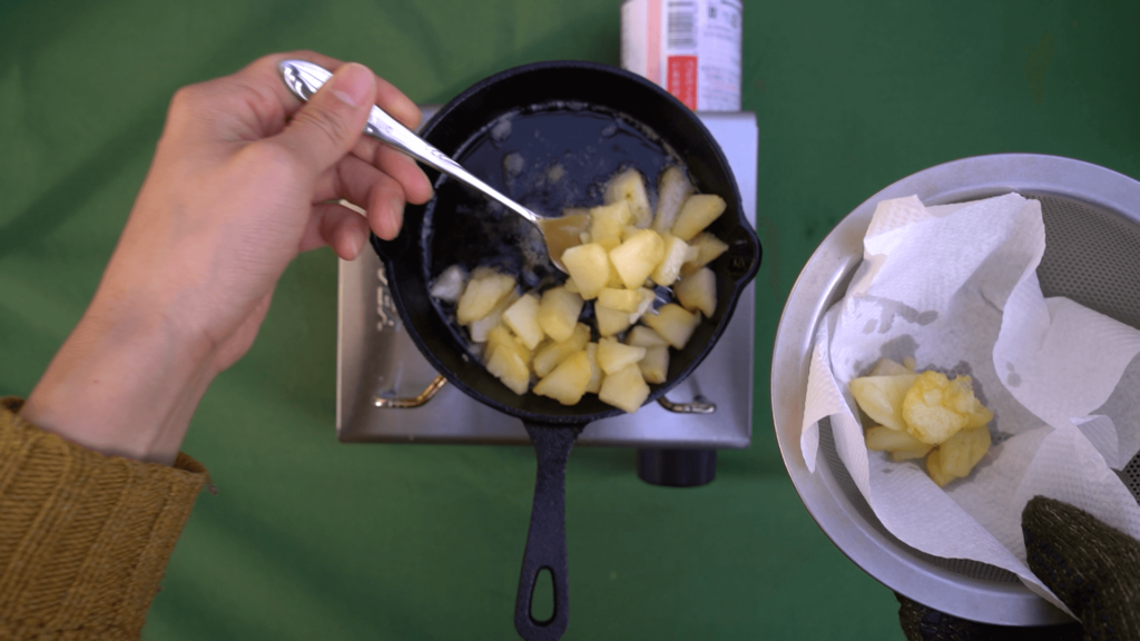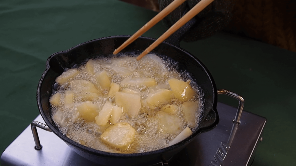 じゃがいもの水分をしっかりと拭き、スキレットにじゃがいもとひたひたの油を入れて揚げていきます。