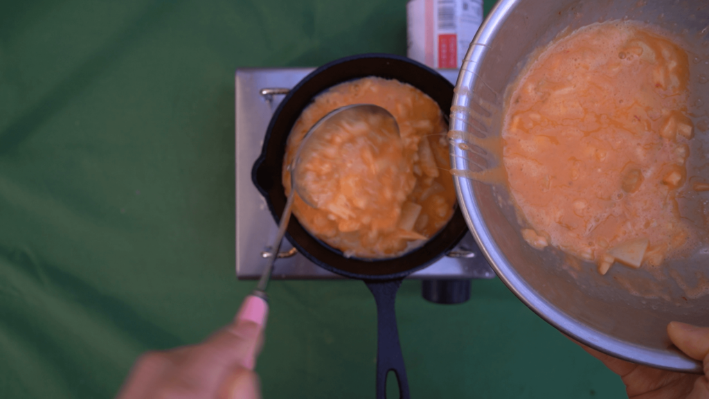 熱したスキレットに油 (じゃがいもを揚げた油を再利用)を引いて、卵液を流し入れます。